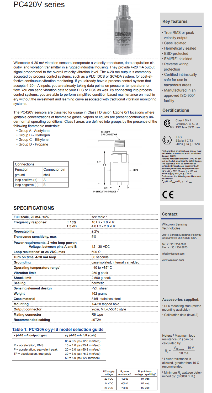 威爾康森回路供電振動傳感器PC420VP-05-IS型