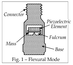 在彎曲設計中,壓電元件以雙懸臂梁的形式固定到震動質量上。圖1顯示了在支點或基座處驅動的傳感元件/質量系統。彎曲設計具有較低的共振頻率,并且通常不適合機械監測應用。由于其高輸出(高達100 V / g),彎曲設計在低水平,低頻地震應用中表現優異。彎曲元件通常是環氧樹脂,這限制了其在高沖擊環境中的應用。