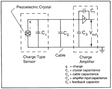 圖2和圖3顯示了典型的電荷放大器系統(tǒng)原理圖,包括:傳感器,低噪聲電纜和電荷放大器。
