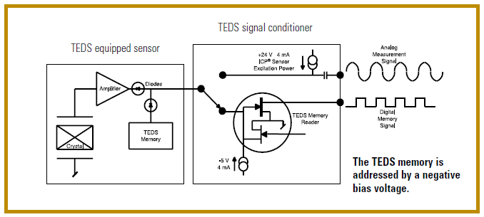 TEDS存儲器電路與傳統的信號調理電路一起內置在ICP®傳感器中。二極管隔離方案有助于ICP®傳感器電路和TEDS電路之間的切換。傳感器將用作普通測量設備,并在使用傳統正電壓正向偏置時輸出模擬測量信號。當傳感器反向偏置并暴露在負電壓下時,可以訪問TEDS存儲器。
