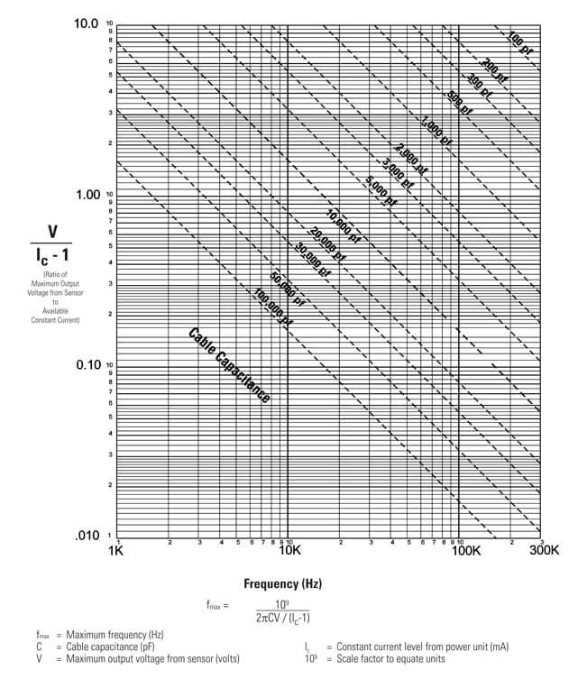 例如,當運行電容為30 pF / ft的100英尺(30.5米)電纜時,總電容為3000 pF。該值可以沿對角電纜電容線找到。假設傳感器工作在5伏的***大輸出范圍并且恒流信號調節器設置為2毫安,則垂直軸上的比率可以計算為等于5.總電纜電容與該比率的交點導致***大頻率約為10.2 kHz。
