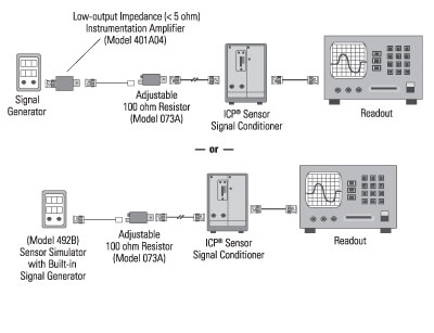 圖13所示的***種方法涉及將標準信號發生器的輸出連接到與ICP®傳感器串聯的單位增益,低輸出阻抗(<5 ohm)儀表放大器。當信號發生器和放大器從系統中移除時,需要極低的輸出阻抗來***小化電阻變化。另一種測試方法,如圖13所示,包含一個傳感器模擬器,它包含一個方便地封裝在一起的信號發生器和傳感器電子器件。