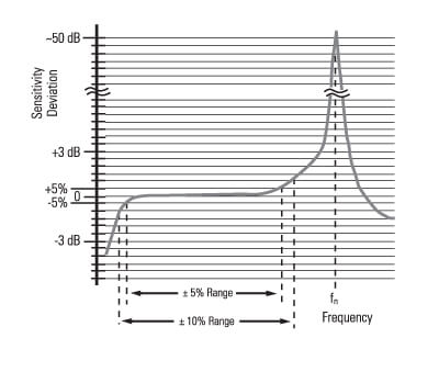 可以看出,靈敏度隨著頻率的增加而增加。對于大多數應用,通常可以在靈敏度偏差小于±5%的范圍內使用該傳感器。該頻率上限發生在諧振頻率的大約20%處。壓力和力傳感器以類似的方式響應。