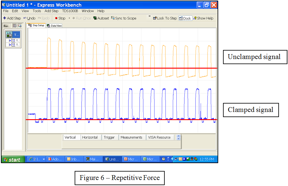 在許多力監(jiān)測應用中,期望監(jiān)測可能在彼此的短時間間隔內發(fā)生的一系列零到峰重復脈沖。該輸出信號通常被稱為“脈沖序列”。來自ICP®石英力傳感器的交流耦合輸出信號將隨時間衰減至平衡狀態(tài)。這使得正峰值力似乎減小,并且難以精確地監(jiān)測連續(xù)的零峰值輸出信號(圖6)。