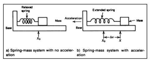 加速度計的設計基于物理現象的應用。在航空領域,加速度計基于旋轉質量的特性。然而,在工業界,這種設計是基于牛頓質量加速定律和胡克彈簧作用定律的結合。這是應用于加速度計制作的***常見設計,因此,在本維基頁面中,我將重點介紹基于牛頓定律和胡克定律的組合加速度計的工作原理。圖1顯示了簡化的彈簧質量系統。在圖1a中,質量m的質量在平衡位置x0處附接到彈簧,該平衡位置x0附接到基部。質量塊可以在底座上自由滑動。假設基礎摩擦可以忽略不計。圖1b顯示了質量通過Δx= x - x0的位移向右移動。由于質量減慢,加速度矢量的方向在左側。在這種情況下,根據牛頓第二定律和胡克定律,質量受制于力量。